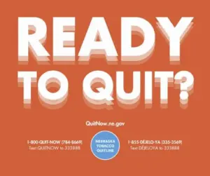 The Nebraska Tobacco Quitline is available 24 hours a day, seven days a week, and offers free, confidential coaching sessions with a qualified quit coach and quit medication such as nicotine patches, gum, or lozenges at no cost to the participant. Coaching is available online as well as over the phone. To get connected with the Quitline, participants can call 1-800-QUIT-NOW (784-8669) or visit www.QuitNow.ne.gov for additional resources and to learn more about free quit medication. Spanish-speaking participants can call 1-855-DÉJELO-YA (335-3569). Translation services are available in over 200 languages.
