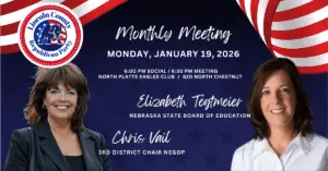 North Platte, NE — The Lincoln County Republican Party invites members, guests, and community supporters to attend its Monthly Meeting on Monday, January 19, 2026, featuring guest speakers Chris Vail, Third District Chair for the Nebraska Republican Party, and Elizabeth Tegtmeier, member of the Nebraska State Board of Education.