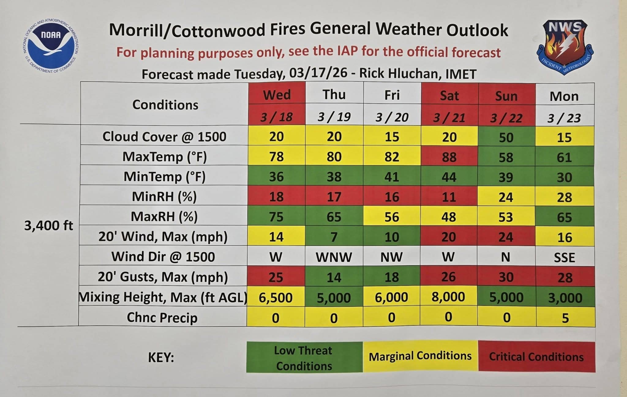 Current Situation: Despite strong winds developing as expected Tuesday, neither the Cottonwood nor Morrill Fires grew notably beyond their current perimeters. Active fire behavior occurred within the existing fire perimeters. All resources continue to work cooperatively on the fire-suppression effort, constructing firelines directly at the fire’s edge and extinguishing areas of heat as they work their way around each fire’s perimeter. Structure-protection crews also remain in place on both fires. And should a new fire start in the area, firefighters assigned to both Cottonwood and Morrill Fires are available and ready to respond quickly. Both fires are also being staffed overnight.